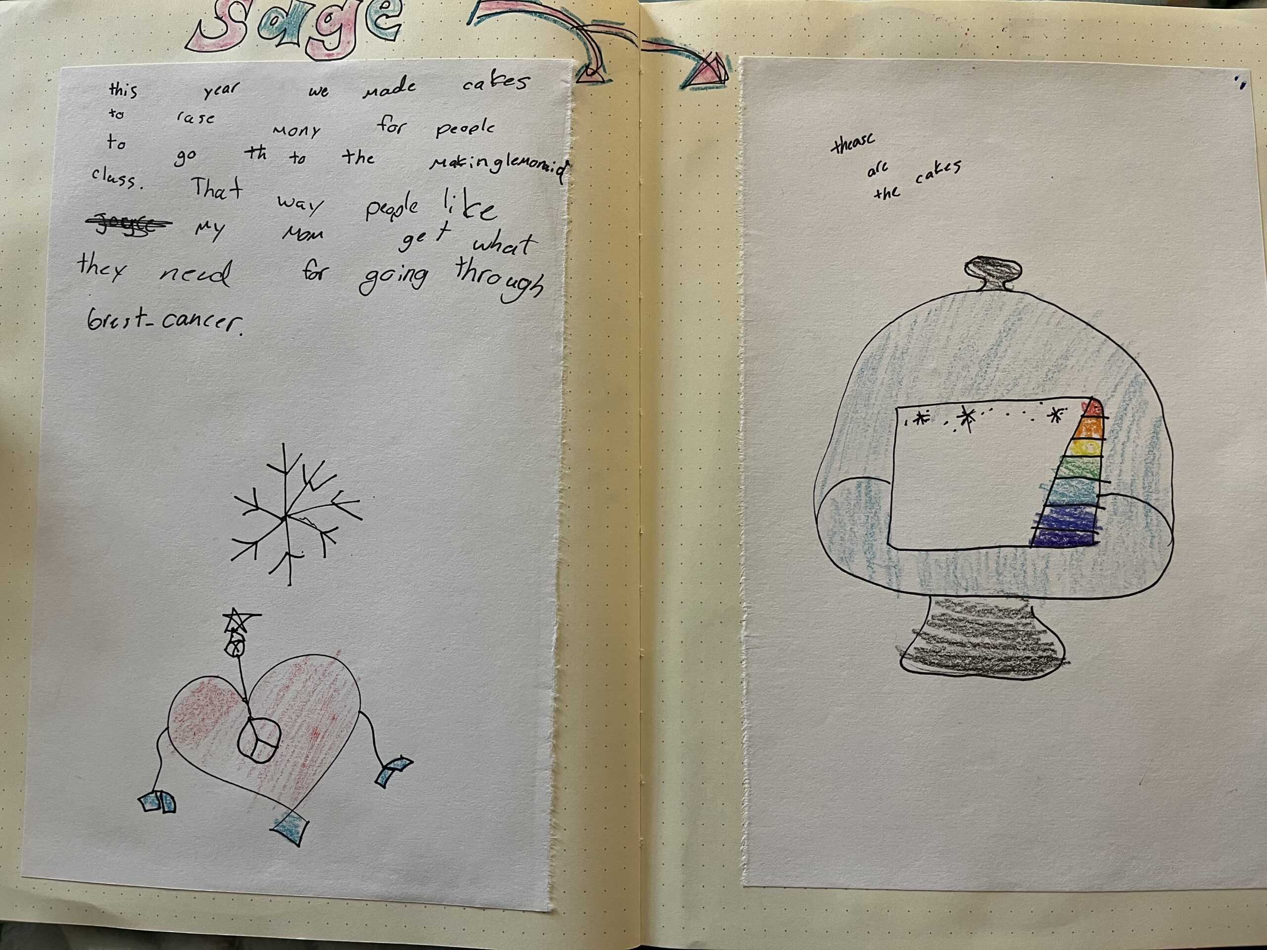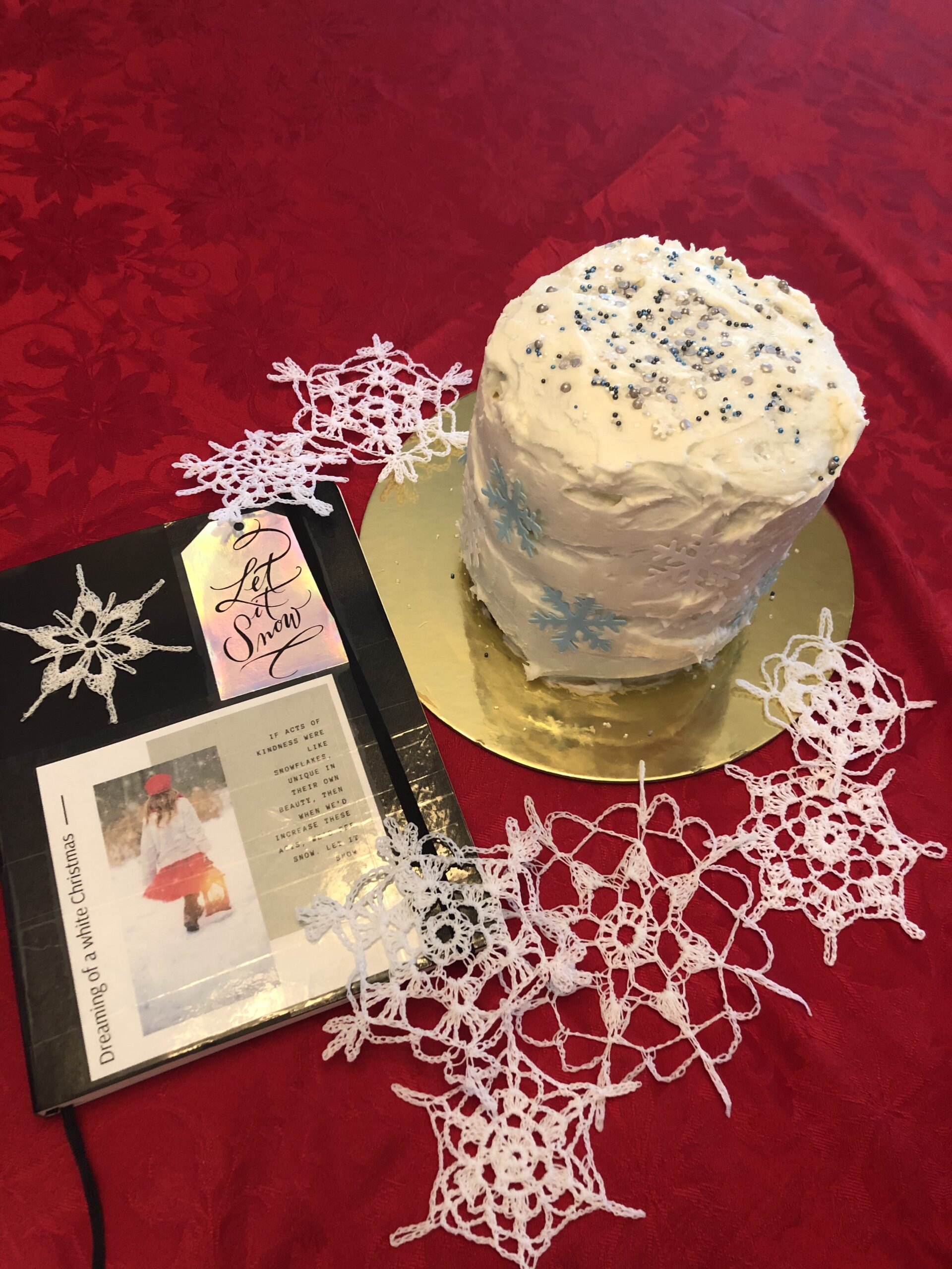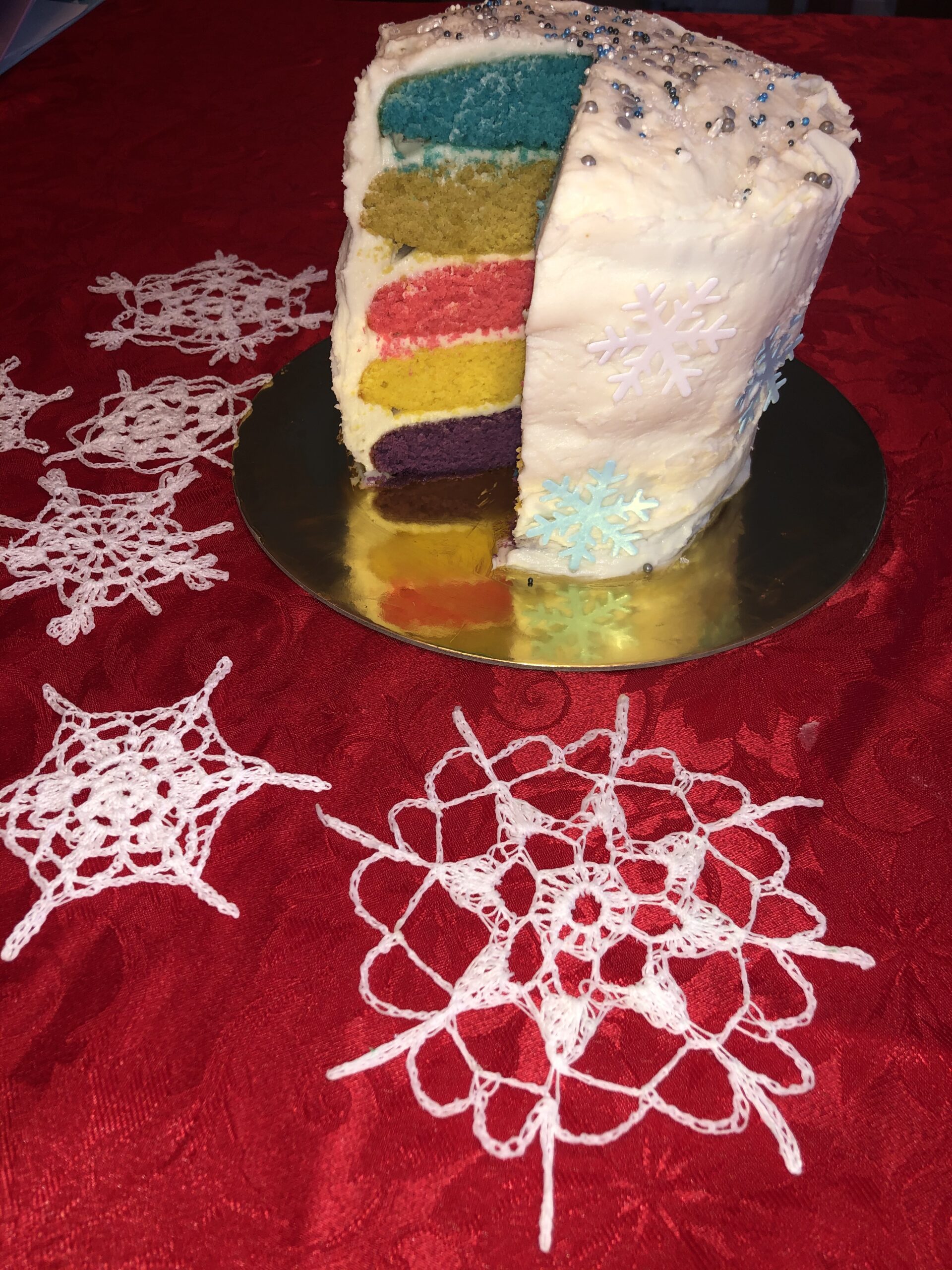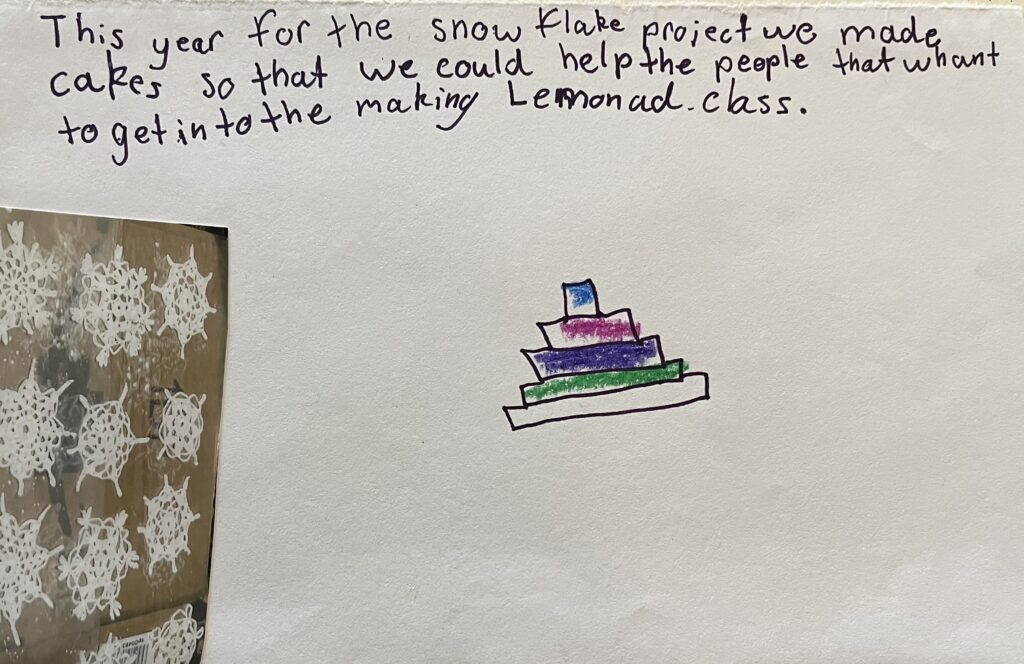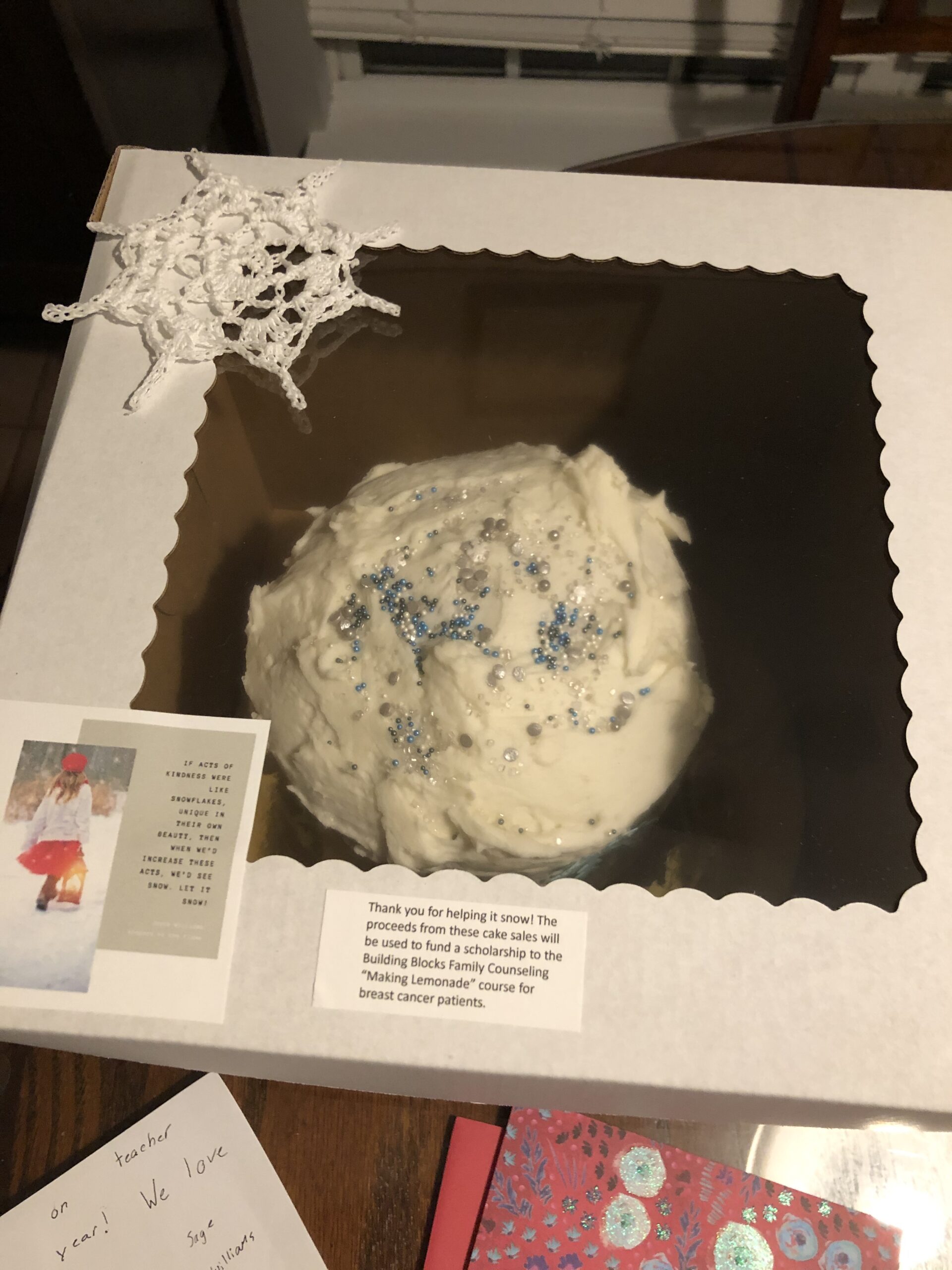 We made 5-layer snowflake cakes from scratch with buttercream frosting to sell and raise money for a scholarship to “Making Lemonade”, a group therapy class for breast cancer patients. Our goal was to sell enough to sponsor one patient (a tuition of $100). When all was said and done, we had enough for ten patients!